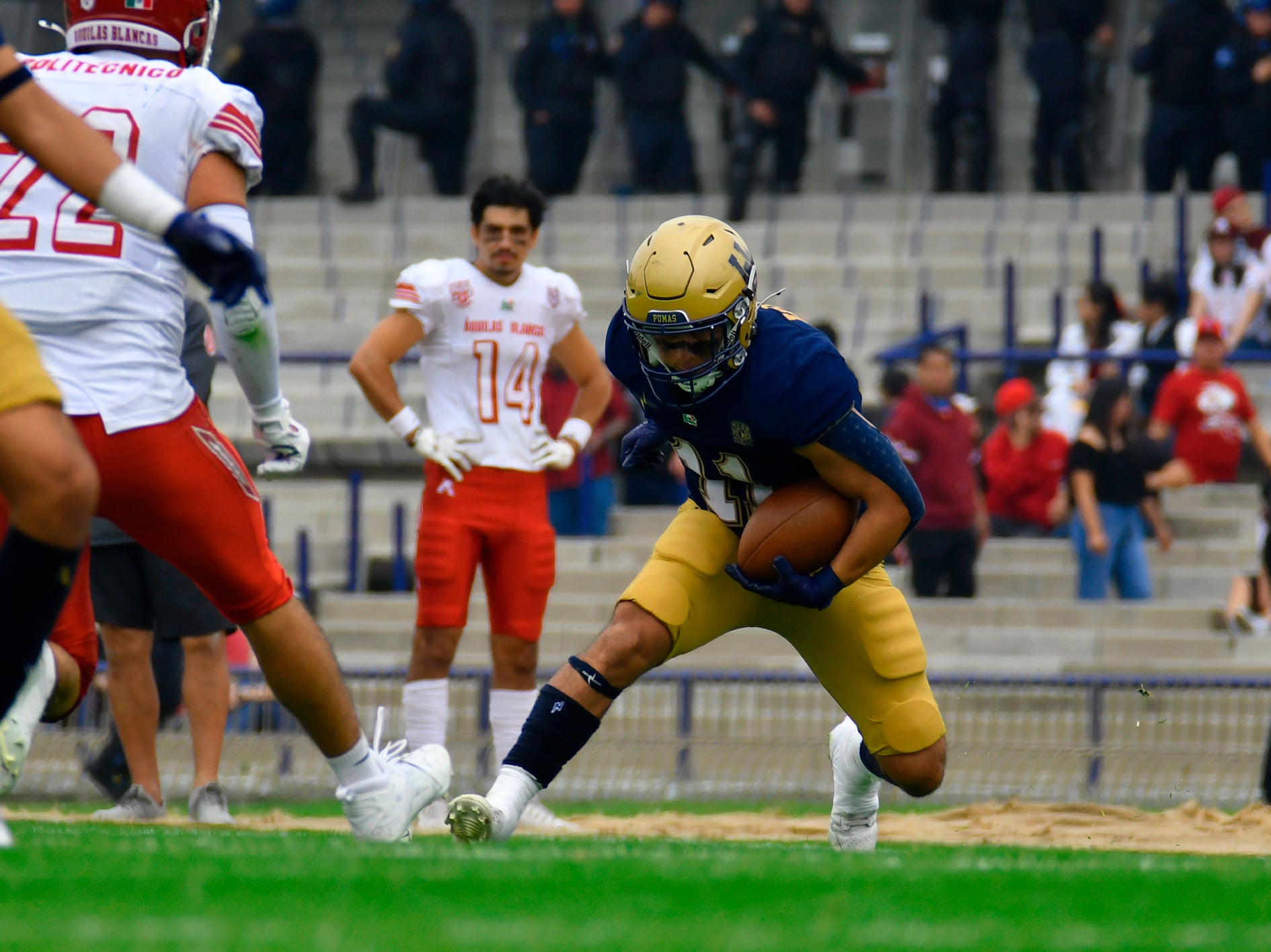 Las acciones: Fue hasta la mitad del primer cuarto que tras la intercepción de Armando Moreno #31 los Pumas abrieron el maracadoer con pase de 31 yardas de Leonardo Garza QB #3 a Edgar Lopéz WR #26 que con gran atrapada a pesar de la buena cobertura del perimetro puso el 7-0. La respuesta fue inmediata con acarreo de 5 yardas de Alan García Gil RB #6 del politécnico para empatar el score 7-7 al final del primer cuarto.